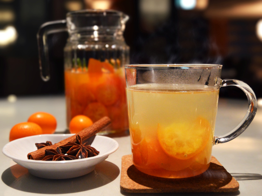 九州産金柑の香りと、はちみつのやさしい甘味。ウイスキーまたはラムで仕上げたホットカクテル。