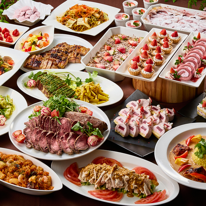 あか牛ローストビーフ&苺デザート 食べ放題 ディナーブッフェ 肉汁あふれる「あか牛のローストビーフ」をはじめ、 バリエーション豊かなシェフ特製料理を心ゆくまで。 人気のデザートは、苺を贅沢に使った、見た目も心躍る春色スイーツが勢ぞろい。 春のお祝いの席や、親しい方と集うひとときにもおすすめのディナーブッフェ。