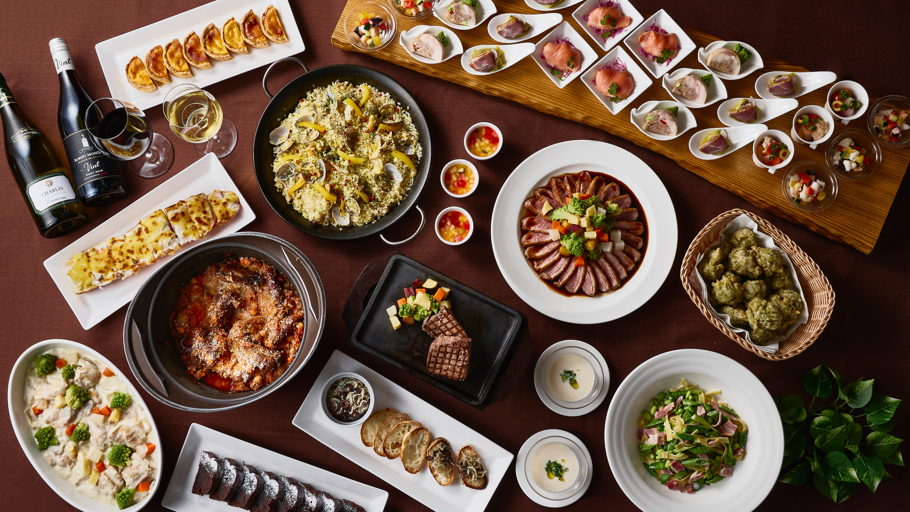 ブッフェボードには「スペアリブの煮込み カスレ風」やフランスの伝統的なソースで味わう肉料理、生パスタ、リゾットなど贅沢なヨーロッパグルメやシェフ特製スイーツが食べ放題。